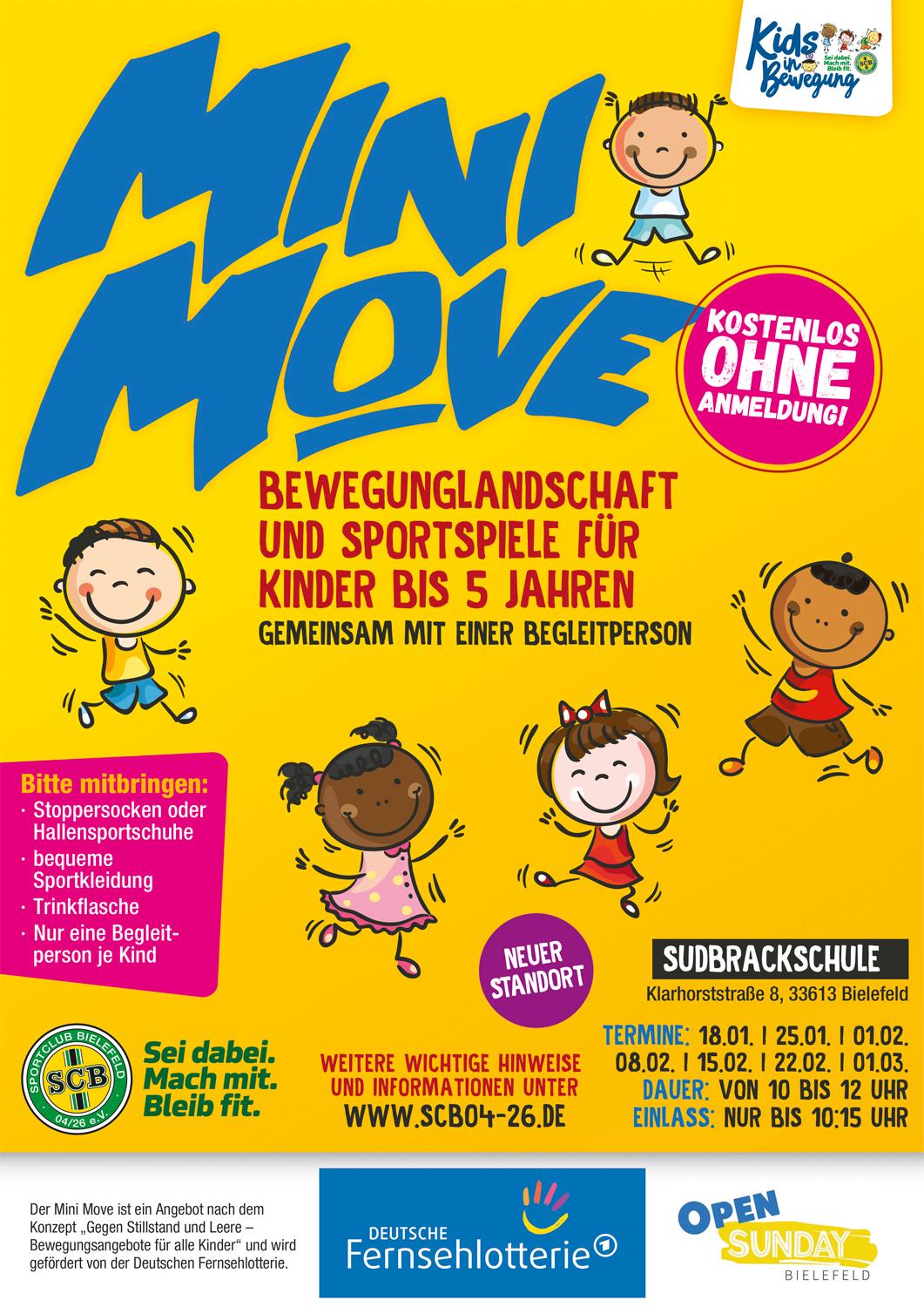 wir freuen uns sehr, Ihnen ein neues, kostenloses Bewegungsangebot ankündigen zu können. In Kooperation mit dem SCB findet ab Sonntag, dem 18.01.26, zusätzlich zum Open Sunday der Mini Move für Kinder bis 5 Jahre in unserer Turnhalle statt. Ingesamt wird es sieben Termine geben.