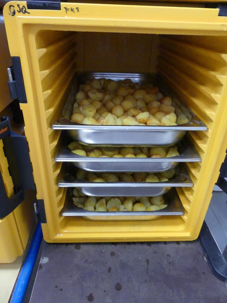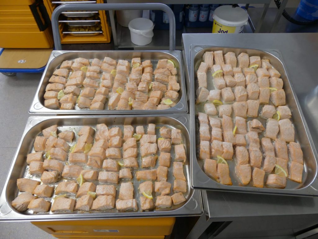 In der FrischeKüche wird bewusst auf Fertigprodukte verzichtet. Gemüse wird frisch verarbeitet, Brühen werden selbst gekocht, Fisch und Geflügel werden vor Ort zubereitet. Wenn Fischstäbchen auf dem Speiseplan stehen, wird das Fischfilet von den Köchinnen portionsgerecht paniert, sodass der Anteil an Panade bewusst gering gehalten wird. Auch beim Pizzateig setzt die FrischeKüche auf traditionelle Zubereitung: Er besteht aus verschiedenen Mehlsorten und bekommt ausreichend Zeit zum Ruhen. Das Brot als Beilage zu Suppen und Eintöpfen wird ebenfalls frisch von den Köchen gebacken.